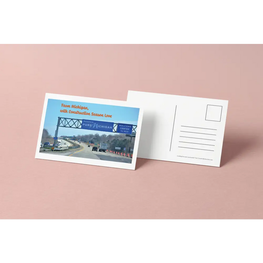From Michigan with Construction Season Love – Funny Road Sign Postcard – Licensed Photography with Original Design