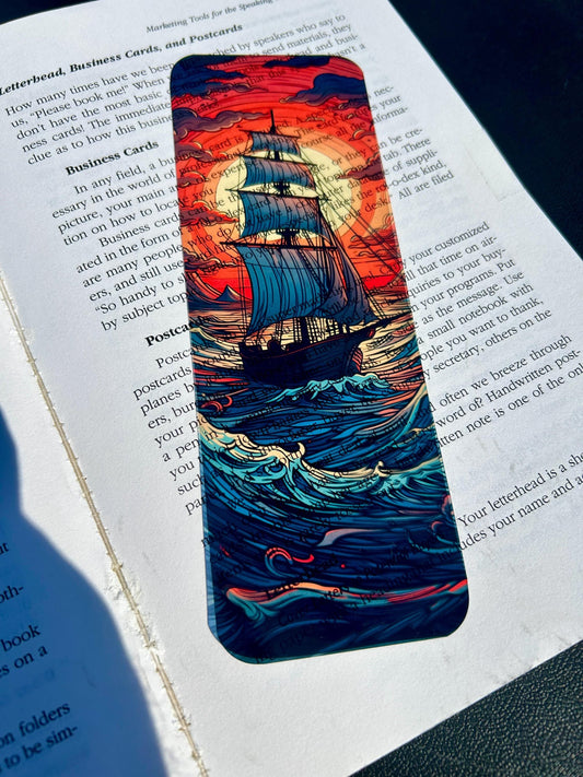 Crimson Sky Ship Bookmark | Nautical Ocean Fantasy Bookmarks for Readers | Sunset Sea Book Marker | Bold Adventure Gift Idea for Book Lovers