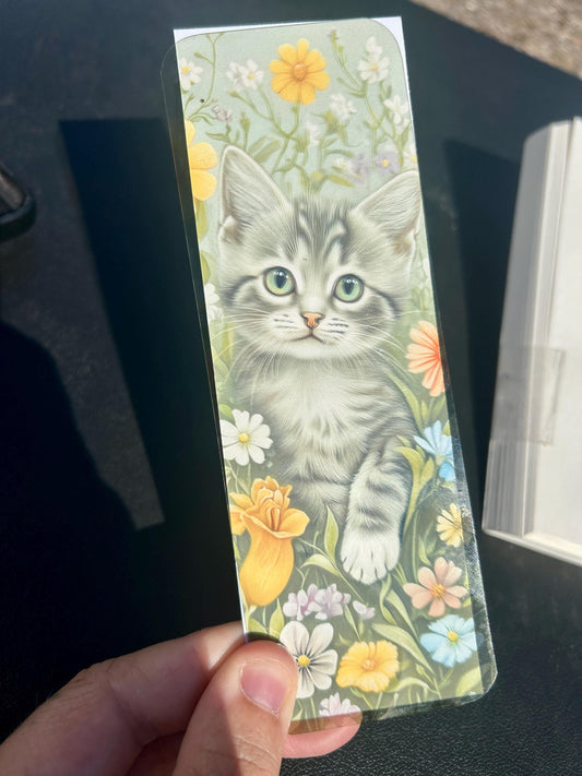 Chartreux Cat Bookmark with Scrapbook Paper Floral Background – Cozy Vintage-Style Art for Cat Lovers, Readers, Handmade Reader Gift