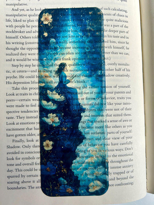 Celestial Dreamscape Bookmark – Girl Reading Under Starry Sky, Fantasy Galaxy Art for Book Lovers, Cosmic Flower Night Gift