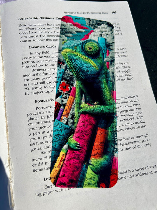 Chameleon Bookmark on Surreal Books and Charcoal Sky – Vibrant Fantasy Art for Creative Readers, Artists