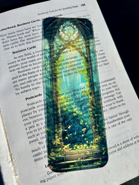 Cathedral Garden Bookmark – Stained Glass Archway with Ivy, Sunlight, and Mystical Forest Path