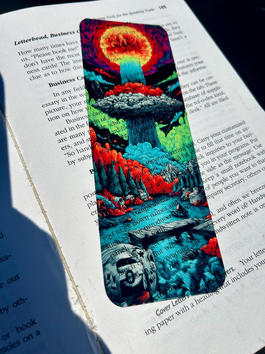 Apocalyptic Bookmark, Neon Nightmare, Dystopian Sci-Fi Art, Cyberpunk Glow for Dark Readers