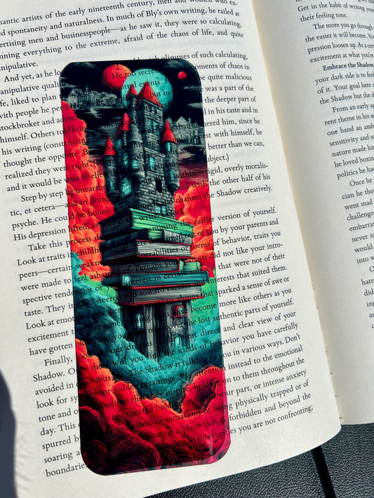 Surreal Book Castle Bookmark with Glowing Windows and Neon Cosmic Sky – Sci-Fi Fantasy Art for Readers