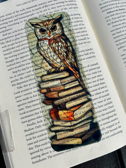 Stained glass owl bookmark with vintage book stack, wise brown owl perched on books