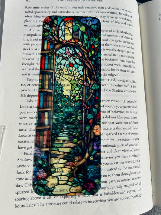 Stained Glass Library Garden Bookmark – Vibrant Bookshelf Pathway Design with Floral Arch and Magical Window for Book Lovers