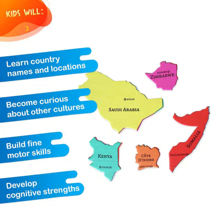 - SKILL-BUILDING | Choosing and placing puzzle pieces builds fine motor skills. Kids have enhanced cognitive development as they try to solve the puzzle. Plus they learn and practice their vocabulary of different countries.