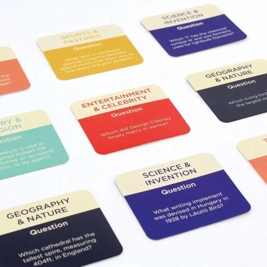 Including six trivia categories, this set of three hundred question and answer cards ensures hours of intriguing after dinner fun! Flabbergast your friends and family with your geographical genius, your musical master or your historical know-how!