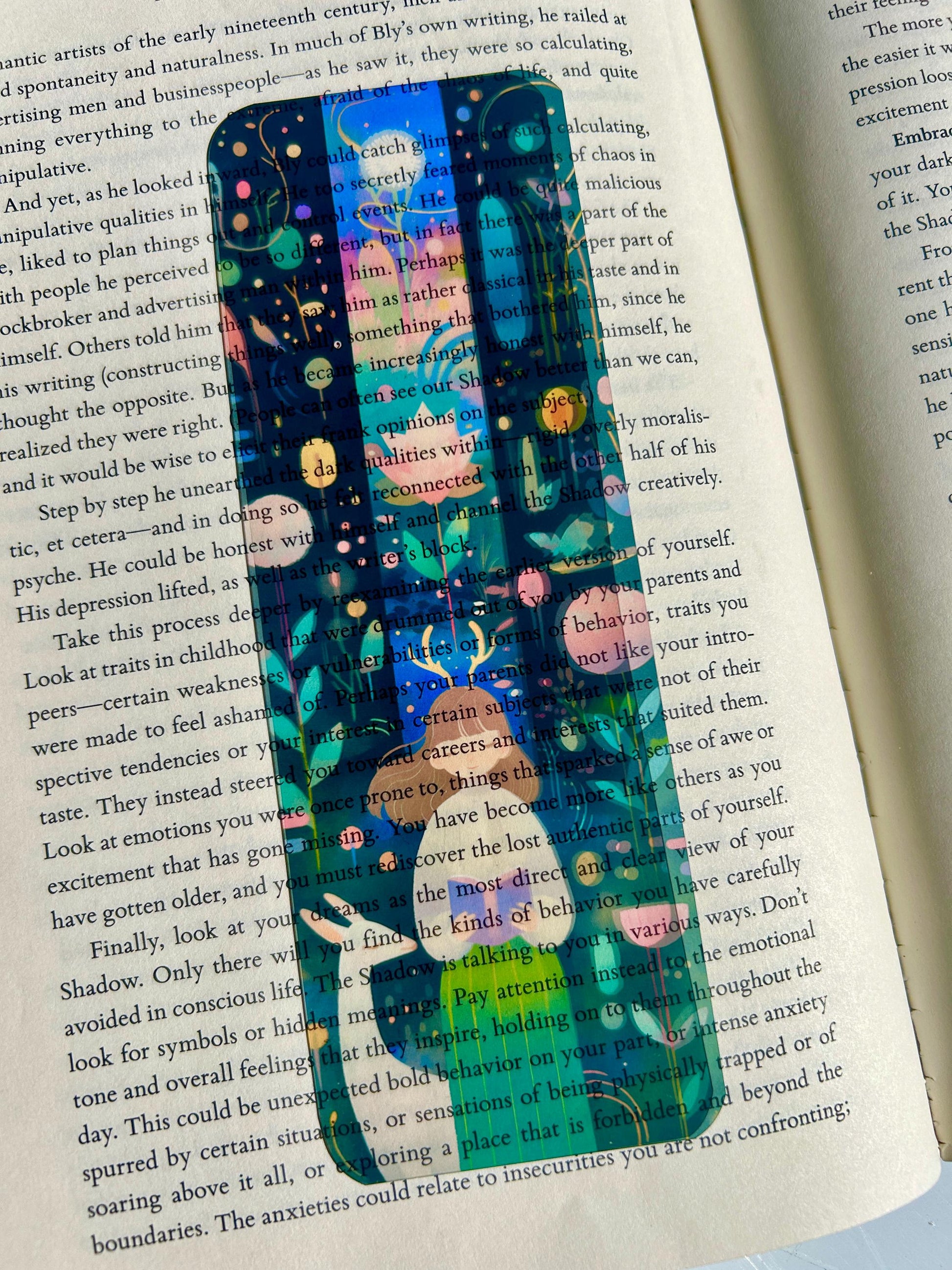 🌸🦌 Step into a world of gentle wonder with this stunning bookmark featuring a calm, antlered girl reading beside a white deer. She's surrounded by blooming celestial flowers and surreal floating orbs under a dreamy twilight sky