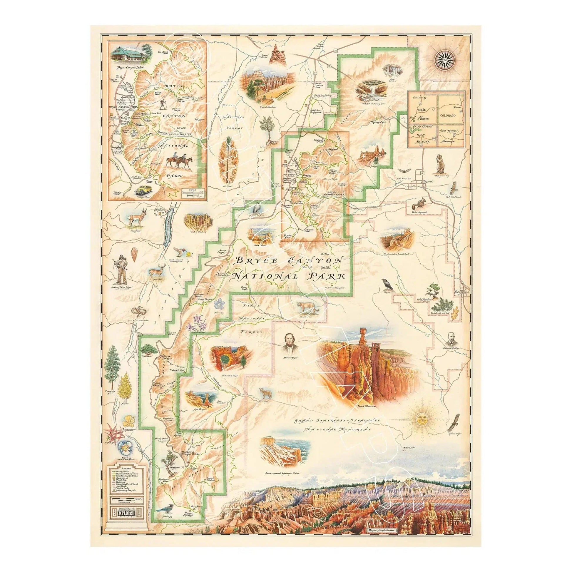 This puzzle features a hand-illustrated map of Bryce Canyon. Original hand-drawn pen and ink / watercolor artwork by Chris Robitaille of Xplorer Maps.