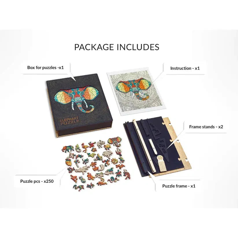 The Elephant wooden puzzle is a large-format puzzle that is sure to challenge and entertain people of all ages. The puzzle features 250 large, irregularly shaped wooden pieces that are precision-cut from high-quality wood. The puzzle is shaped like an elephant, making it a fun and educational puzzle for children and adults alike.
