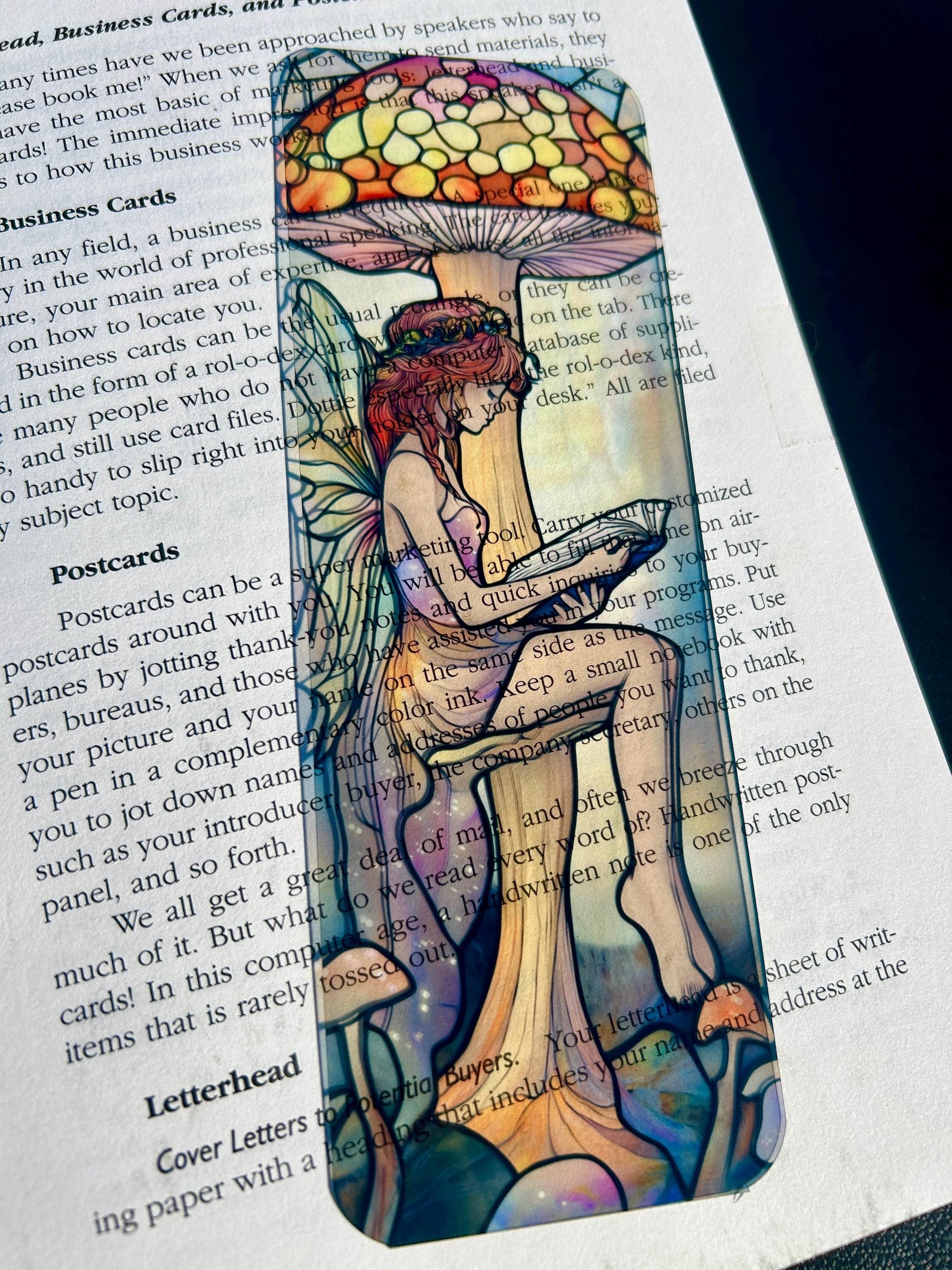 Fairy Reading Under Mushroom Bookmark in Pastel Pink and Stained Glass Style – Whimsical Fantasy Art for Book Lovers, Fairy Tale Fans