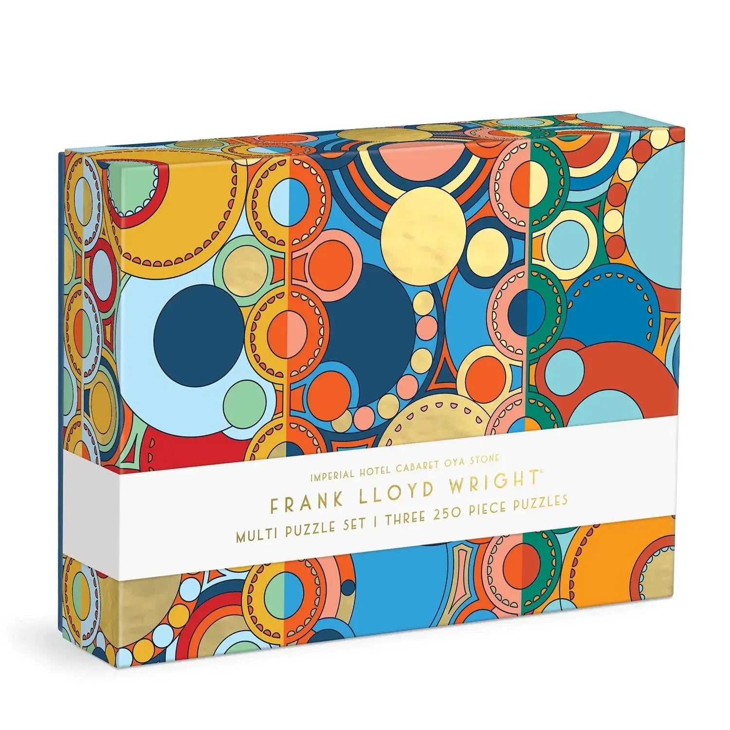 The Frank Lloyd Wright Imperial Hotel Multi Puzzle Set includes three 250 Piece coordinating puzzles of Wright’s iconic art. Galison puzzles are packaged in matte-finish sturdy boxes, perfect for gifting, reuse, and storage. Three color inserts of each full puzzle image are also included.