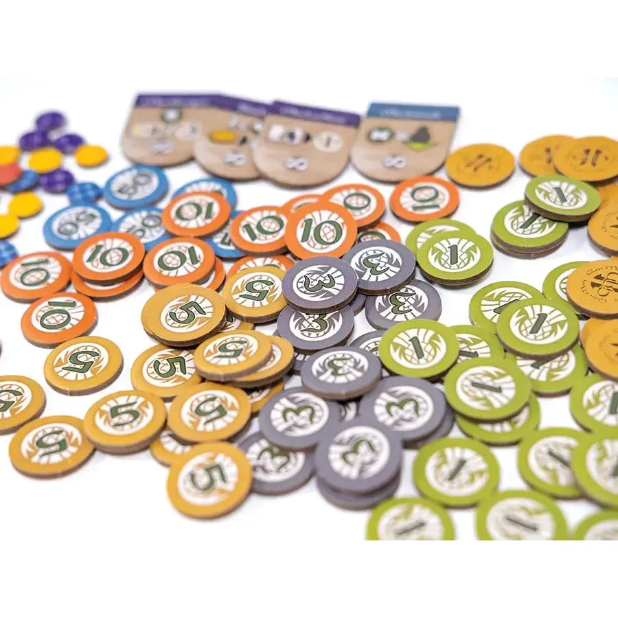 Includes: Rulebook, 2 game boards, 40 Player Pieces, 250 cardboard markers, (Clan Marker, Coins, Victoria Point Tokens, Clan Shields, Boat Race Markers, Penny Markers, Mobster Tokens Haggis Tokens, Voting Marker, England Marker), 90 Wooden Resources, 1 Die, 8 Chronicle Boxes, 25 Whisky Casks, 4 Home Territory Tiles, 2 NPC River Tiles, 4 Boats, 1 Market Overlay, 1 Mountain, 102 Tiles, 3 Sticker Sheets, 83 Cards - that's it. This game box is 7.15 lbs !