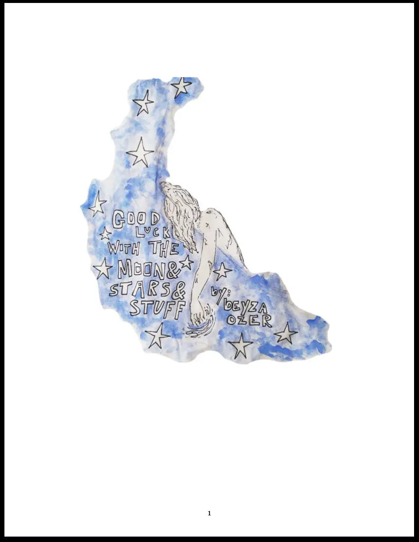 "beyza ozer’s GOOD LUCK WITH THE MOON & STARS & STUFF is a spirit-collage made out purple tenderness. it’s a tiny heart attack spelunking in the back pocket of Anxiety’s jeans. it’s a mystical portal to a cave you heard about. the one that shouldn't have wildflowers inside of it but it does and it tickles. it’s that awkward moment when we realize the mortality of human feeling is both visceral and adorable and that’s a l r i g h t. trust me. i know things."