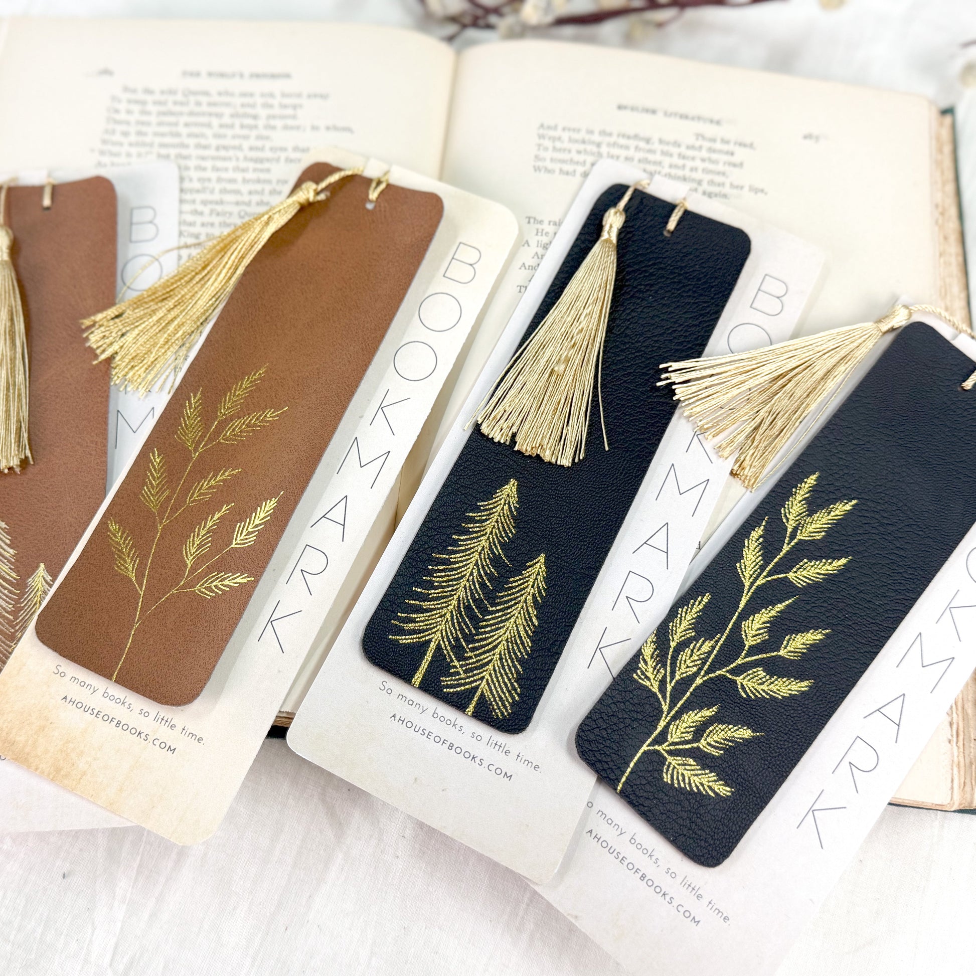 Faux leather tassel bookmarks foiled by hand by our in house artist in various trees and evergreen branches. Each bookmark is unique and created by hand in neutral colors.