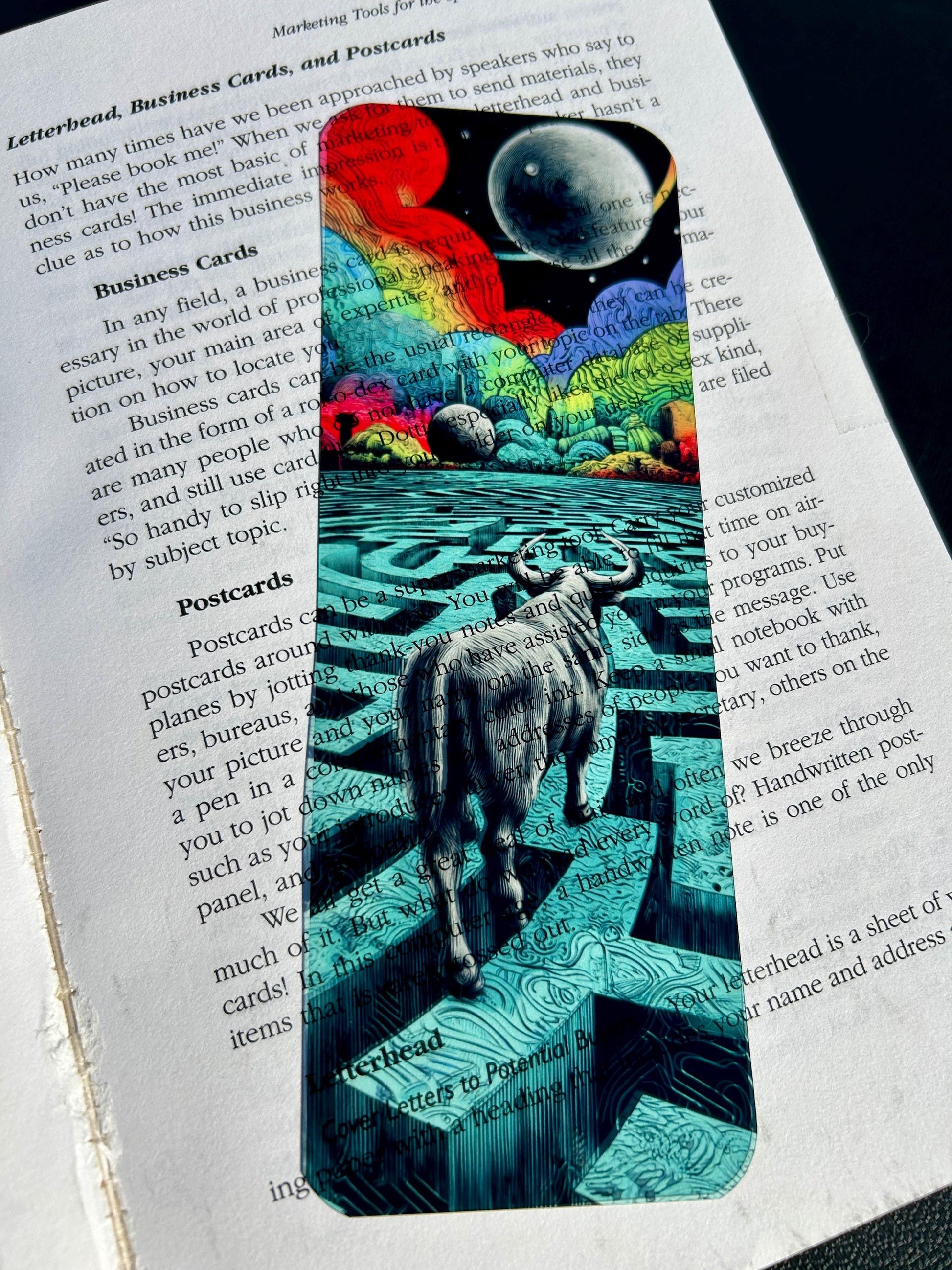 Minotaur Bookmark – Surreal Labyrinth Art with Rainbow Planets | Myth-Inspired Gift for Readers