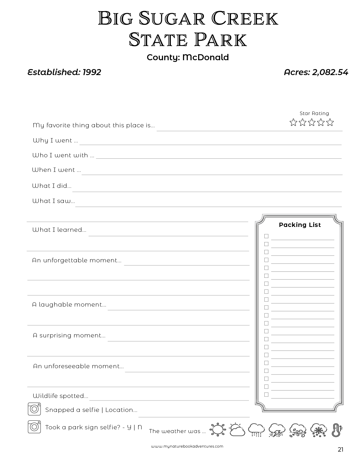Do you dream of exploring all of the State Parks in Missouri? The Missouri State Parks Adventure Book helps you plan, discover, and collect memories from your adventures. With room to write down your must-see sights, plan your trip, and add photos, this adventure book is perfect for nature lovers of all ages. Plus, each page contains interesting facts about the park you’re exploring. Take on the adventure – and find new places to explore, new things to see, and moments to remember!
