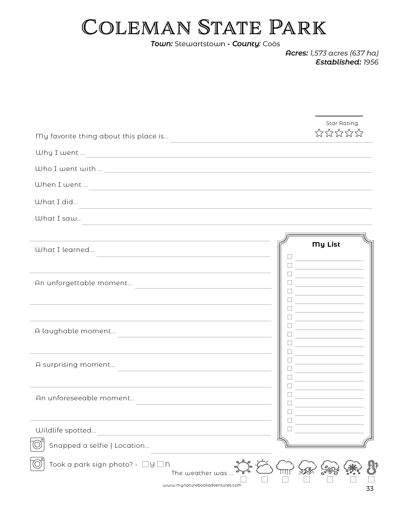 Do you dream of exploring all of the State Parks in New Hampshire? The New Hampshire State Parks Adventure Book helps you plan, discover, and collect memories from your adventures. With room to write down your must-see sights, plan your trip, and add photos, this adventure book is perfect for nature lovers of all ages. Plus, each page contains interesting facts about the park you’re exploring. Take on the adventure – and find new places to explore, new things to see, and moments to remember!