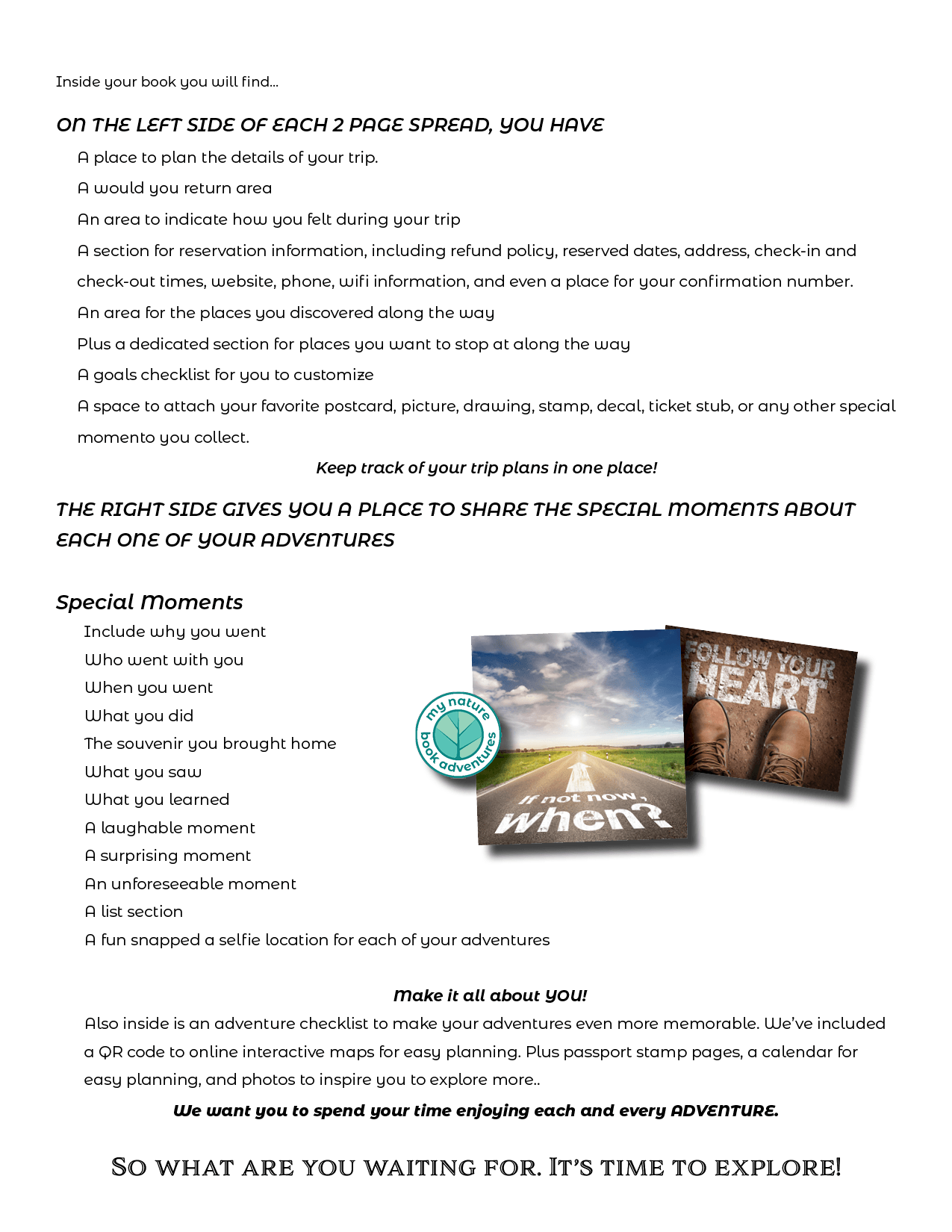 EACH BOOK HAS A DEDICATED 2-PAGE SPREAD TO SAVE THE MEMORIES FROM EACH ADVENTURE.