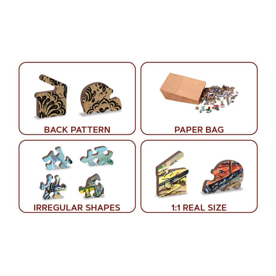 Each puzzle contains numerous unique shapes, characters, figures, and symbols that are cut seamlessly into the pattern. Think of these as mysterious little surprises each puzzle experience offers. These puzzles offer a high quality, rich beautiful image on the front and a detailed wallpaper style pattern on the back. Wooden City double-sided wooden puzzles offer a unique building experience that is sure to captivate puzzle enthusiasts of all ages.