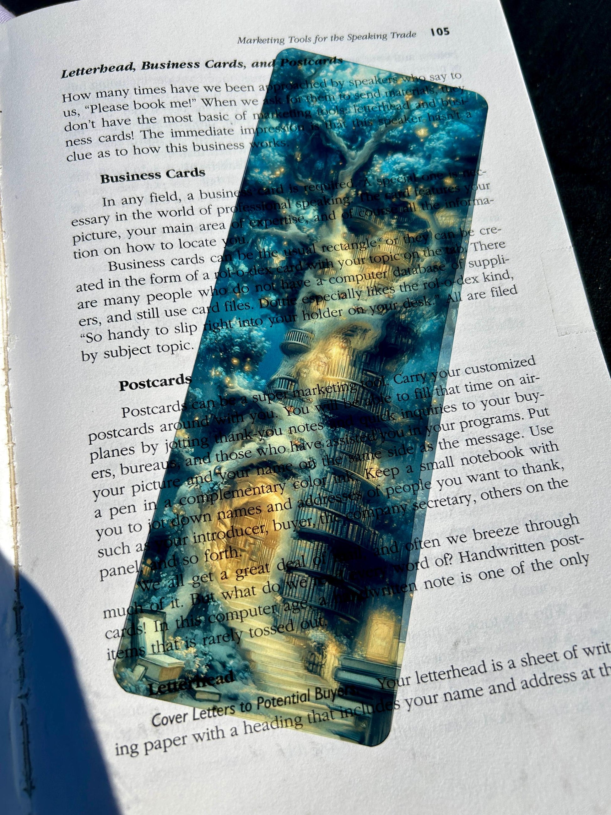 Secret Tree Library Bookmark – Glowing Staircase & Towering Shelves in a Magical Tree, Fantasy Bookmark for Dreamy Readers