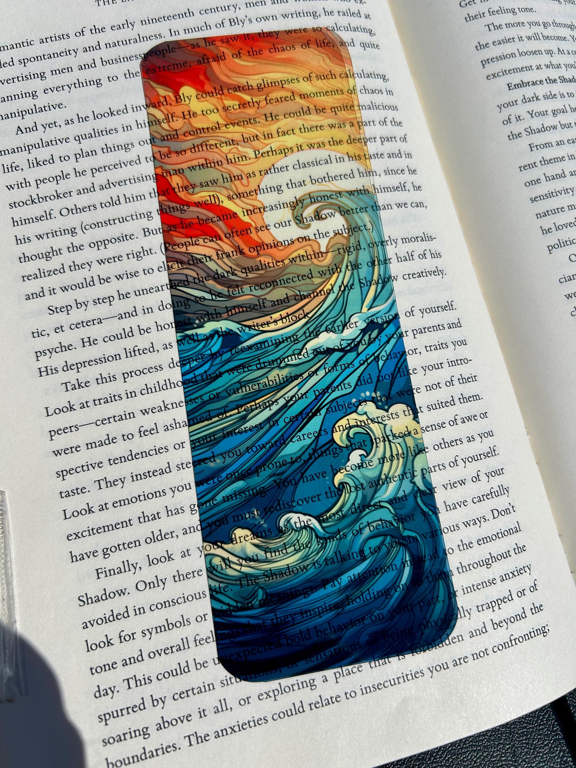 Stained Glass Ocean Waves Bookmark with Fiery Sunset and Cool Blue Sea – Calming Coastal Art for Mindfulness, Therapy, and Book Lovers