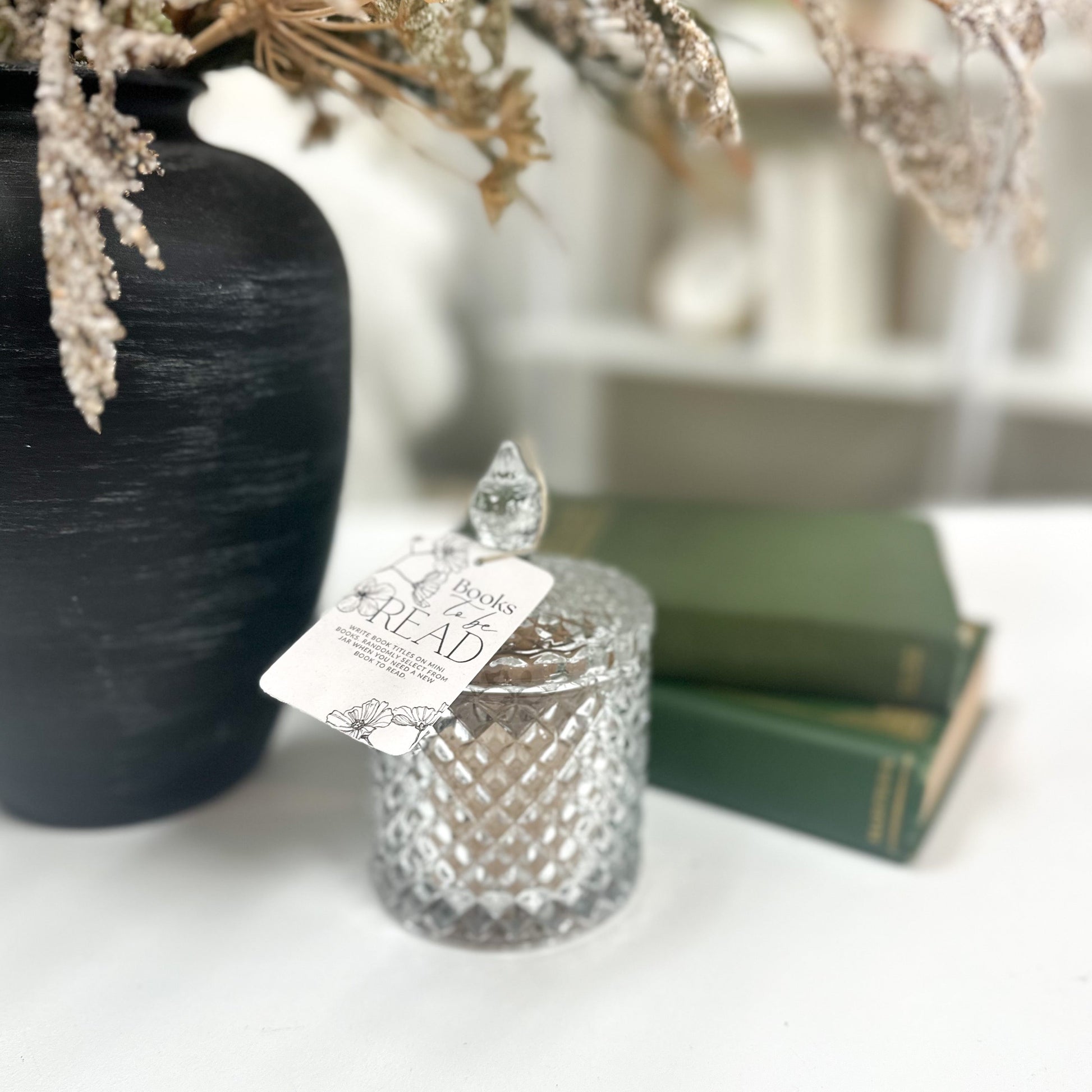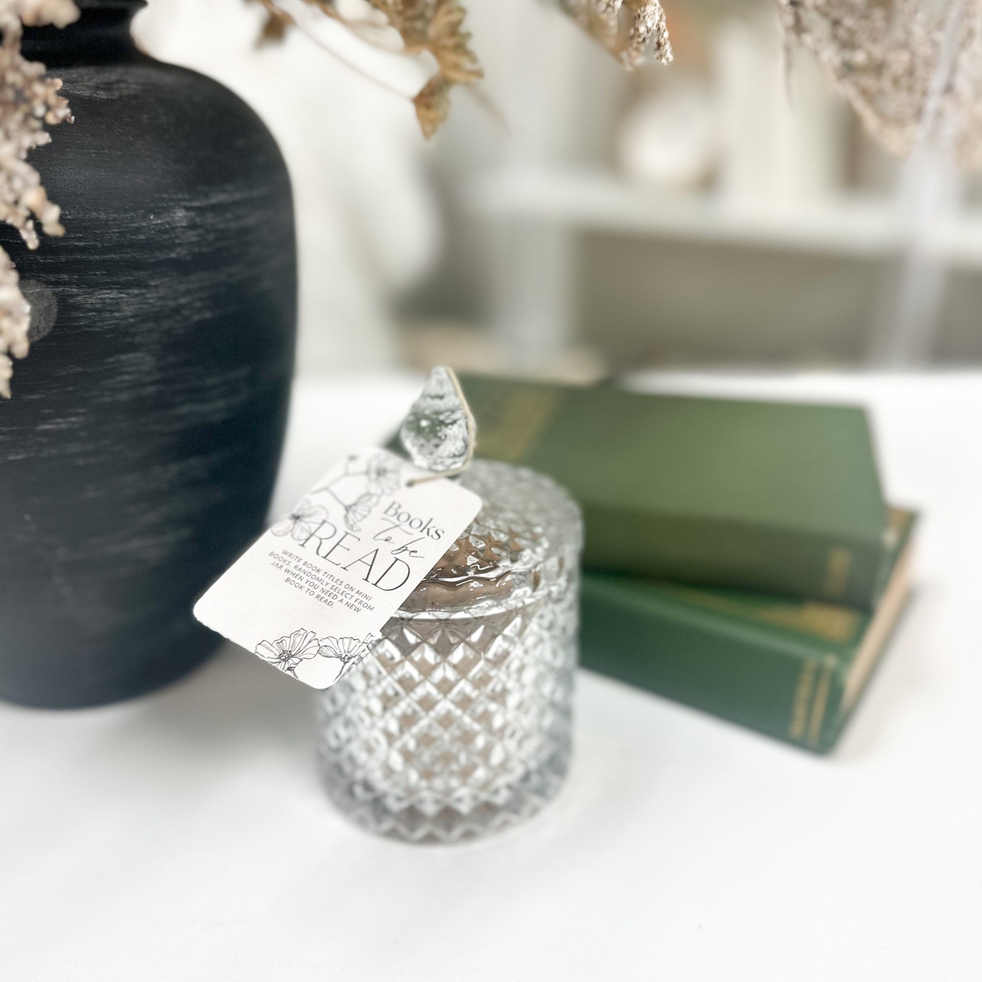 Stunning crystal glass jar with lid to organize the books you want to read. Includes folded cardstock mini books to write the title of book. When you are ready to read your next book, simply randomly pull your next read out of the jar!