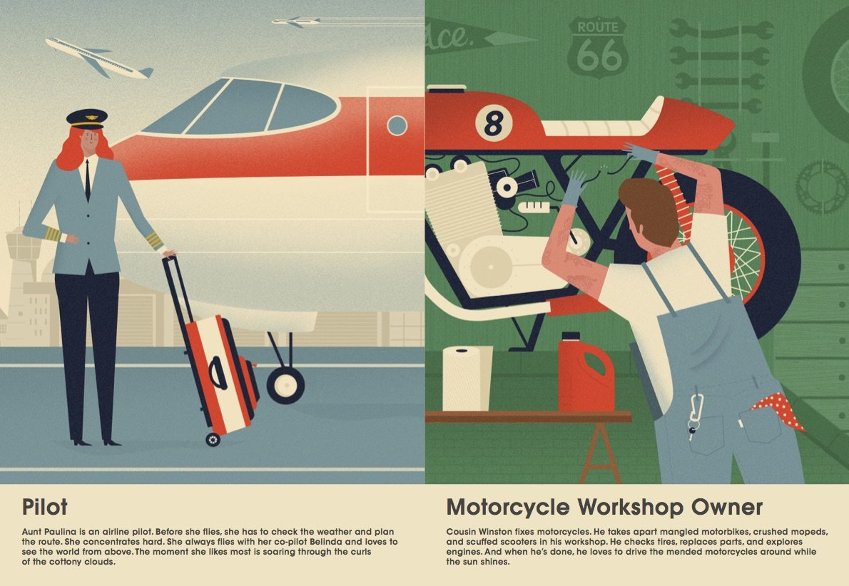 What Do Grown-Ups Do All Day? depicts punk rock drummers, journalists, male nurses, bistro chefs, designers, and more. What Do Grown-Ups Do All Day? illustrates that anything is possible for girls and boys.
