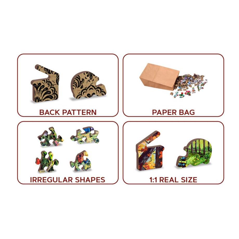 Each puzzle contains numerous unique shapes, characters, figures, and symbols that are cut seamlessly into the pattern. Think of these as mysterious little surprises each puzzle experience offers. These puzzles offer a high quality, rich beautiful image on the front and a detailed wallpaper style pattern on the back. Wooden City double-sided wooden puzzles offer a unique building experience that is sure to captivate puzzle enthusiasts of all ages.