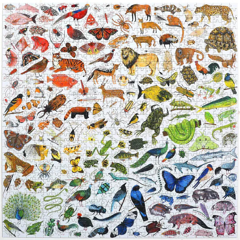 Puzzle your way through eeBoo’s A Rainbow World 1000 Piece Puzzle. The variety of beautiful flora and fauna in our world is truly astounding. Which of these fellow inhabitants of our Rainbow World is your favorite? Jigsaw puzzles are a great activity for the whole family to enjoy. Featuring art by Kelsey Oseid (@kelzuki).