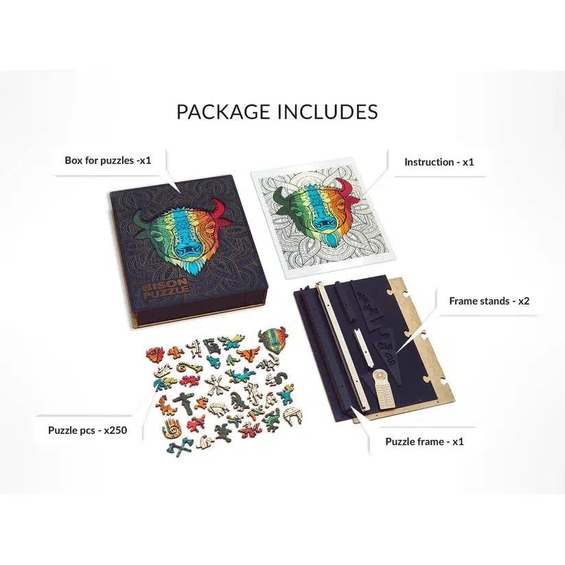 The Bison Shaped Jigsaw Piecezz Puzzle is a unique and challenging puzzle that is perfect for people of all ages. The puzzle consists of 250 irregular wooden pieces that are shaped like a bison.