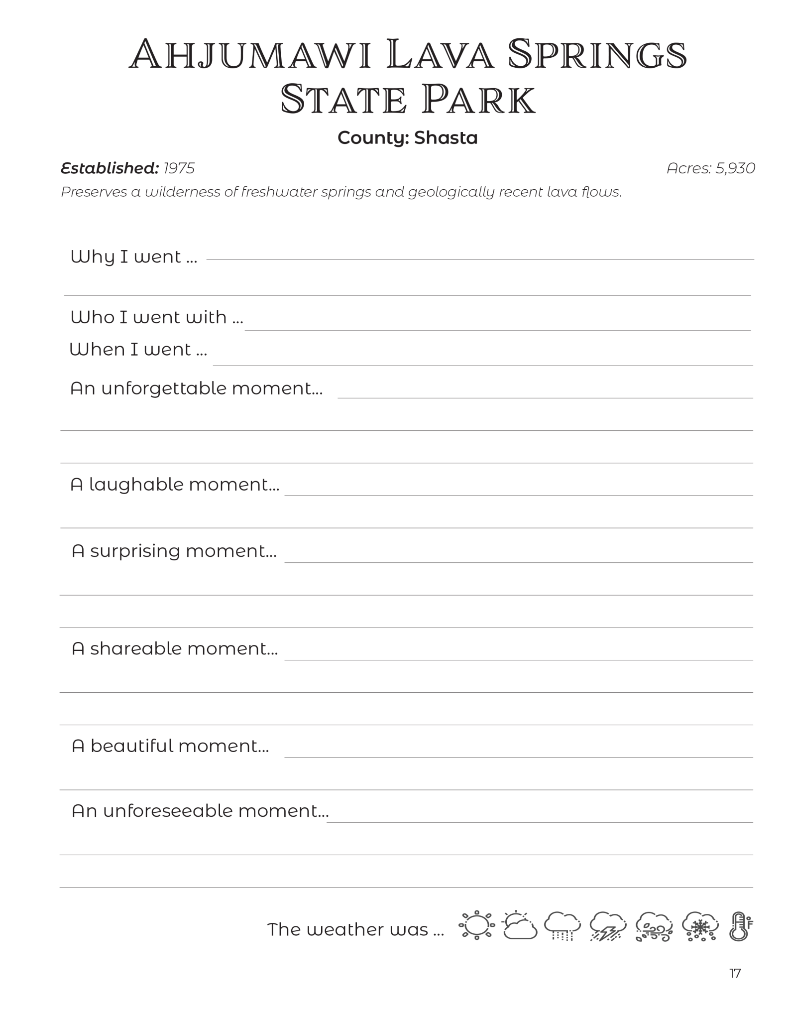 Do you dream of exploring all of the State Parks in California? The California State Parks and Beaches Adventure Book helps you plan, discover, and collect memories from your adventures. With room to write down your must-see sights, plan your trip, and add photos, this adventure book is perfect for nature lovers of all ages. Plus, each page contains interesting facts about the park you’re exploring. Take on the adventure – and find new places to explore, new things to see, and moments to remember!