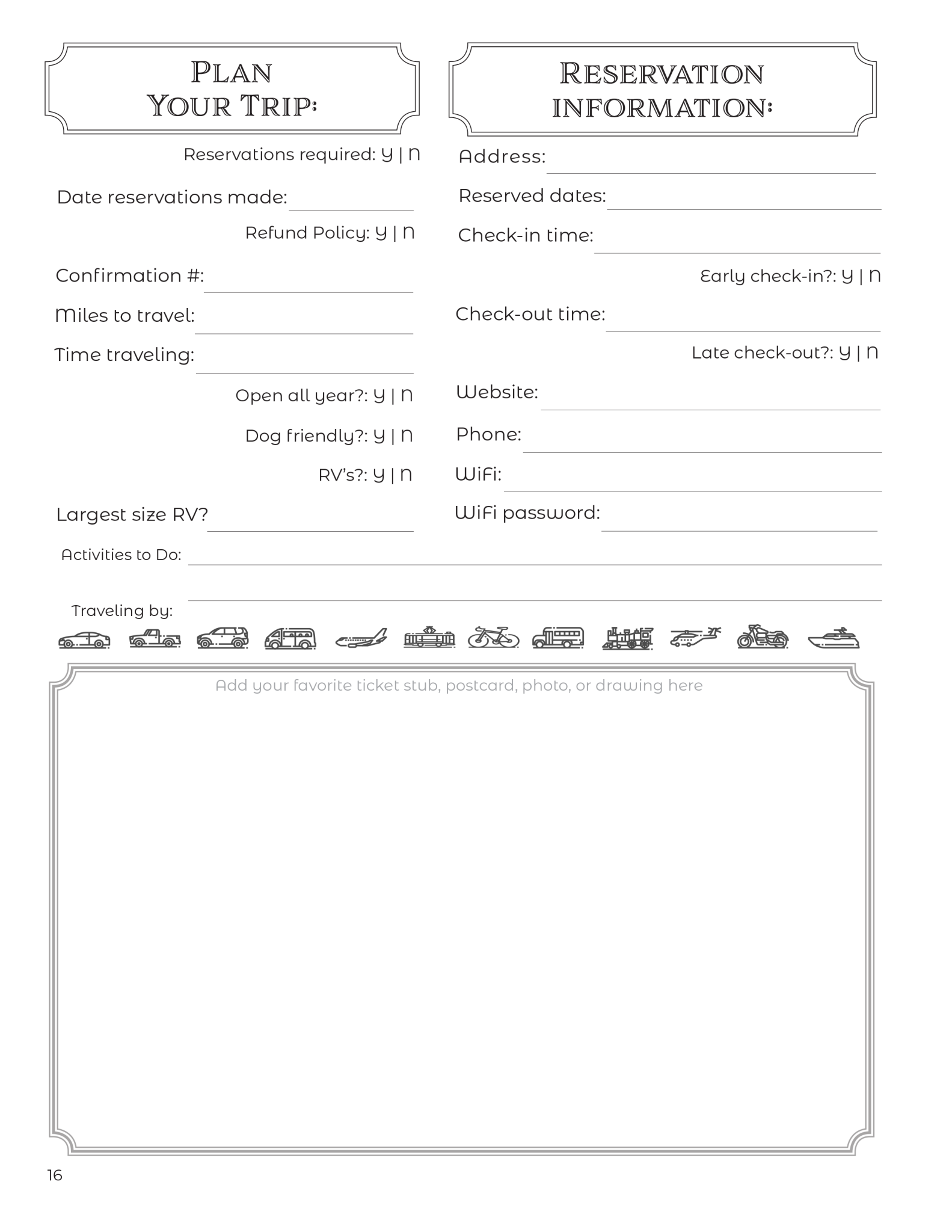 - A section for reservation information, including refund policy, reserved dates, address, check-in and check-out times, website, phone, wifi information, and even a place for your confirmation number.