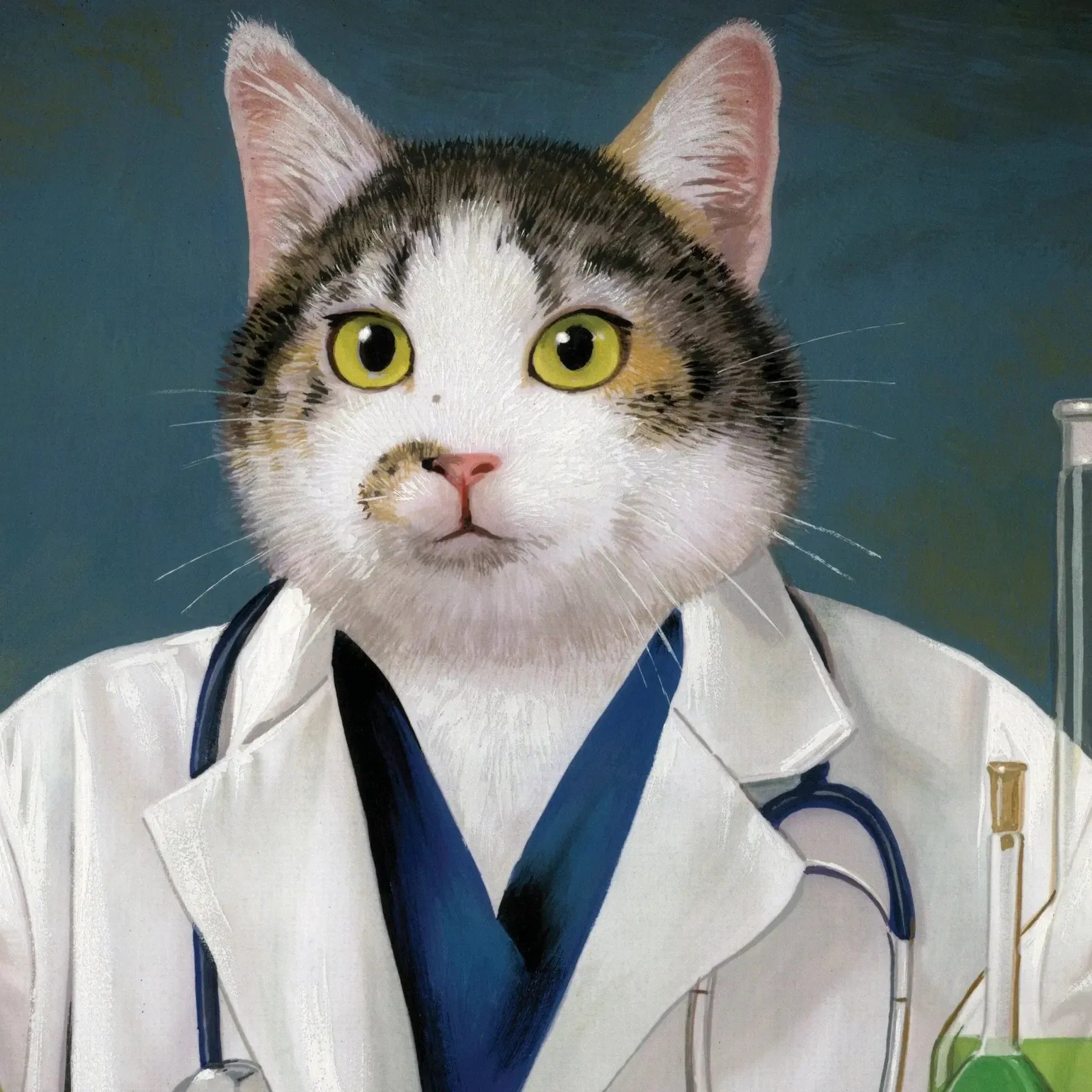Say hello to the purr-fectly professional Copy Cat - Cloned Kitty mini puzzle, featuring the playful artwork of Bill Mayer. This 100 piece puzzle captures a headshot of a feline doctor, complete with scrubs, a crisp white coat, and a stethoscope. It’s the ultimate ID card for a cat doctor at a cat hospital—whimsical, charming, and full of humor!