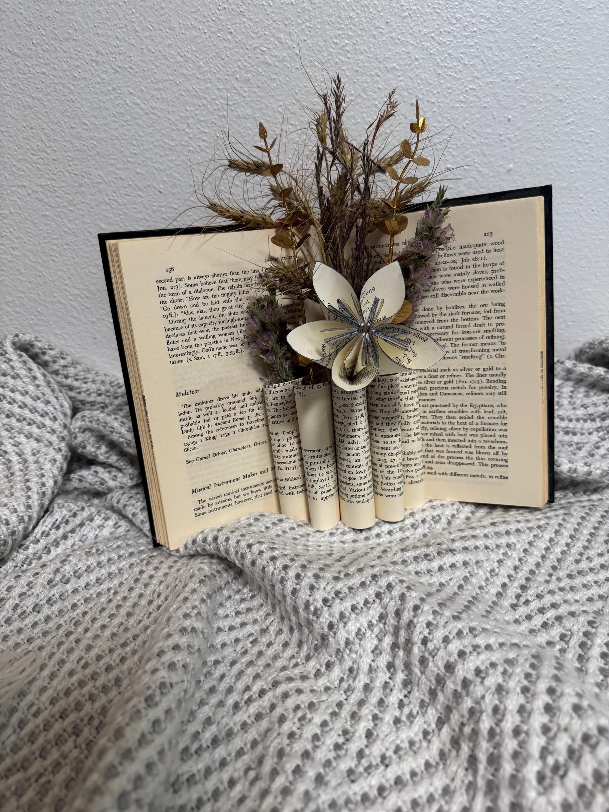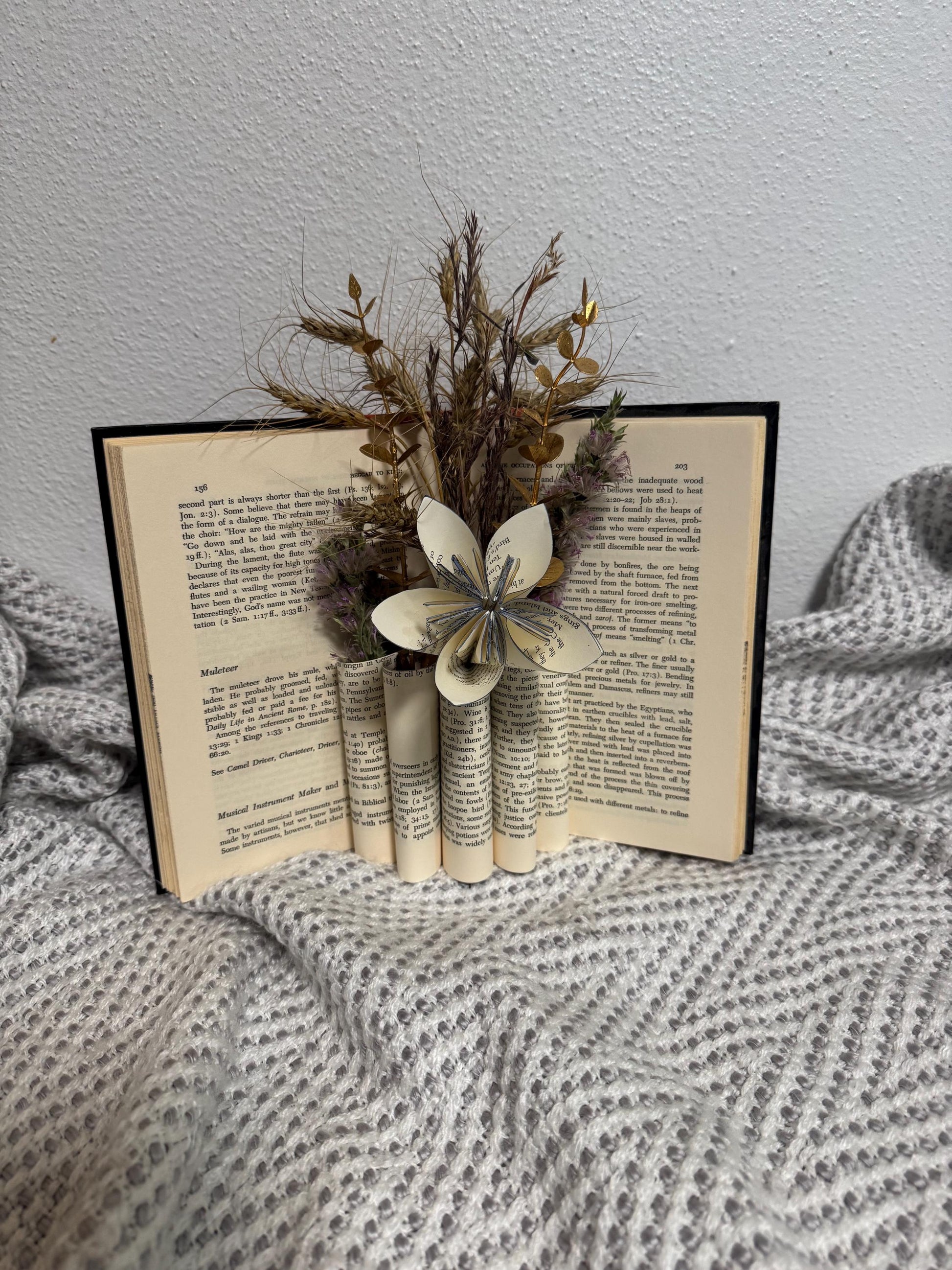 Bring your love of books and flowers together with this one-of-a-kind handmade book flower arrangement. Each piece is crafted from a real, gently-used book and adorned with hand-folded paper flowers and sola wood blooms, accented with greenery and preserved florals.