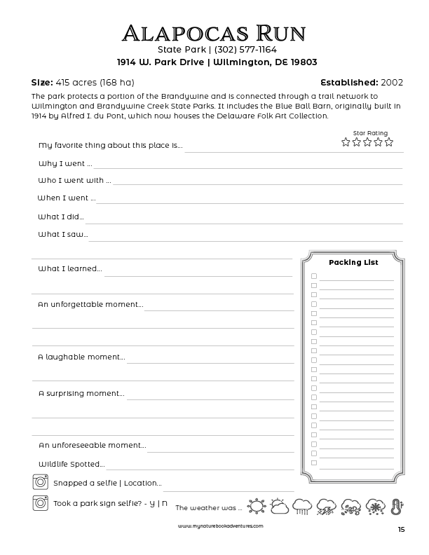 Do you dream of exploring the Delaware State Parks, Wildlife Areas, Conservation Areas, Preserve, and State Forests? The Delaware State Parks Adventure Book helps you plan, discover, and collect memories from your adventures. With room to write down your must-see sights, plan your trip, and add photos, this adventure book is perfect for nature lovers of all ages. Take on the adventure – and find new places to explore, new things to see, and moments to remember!