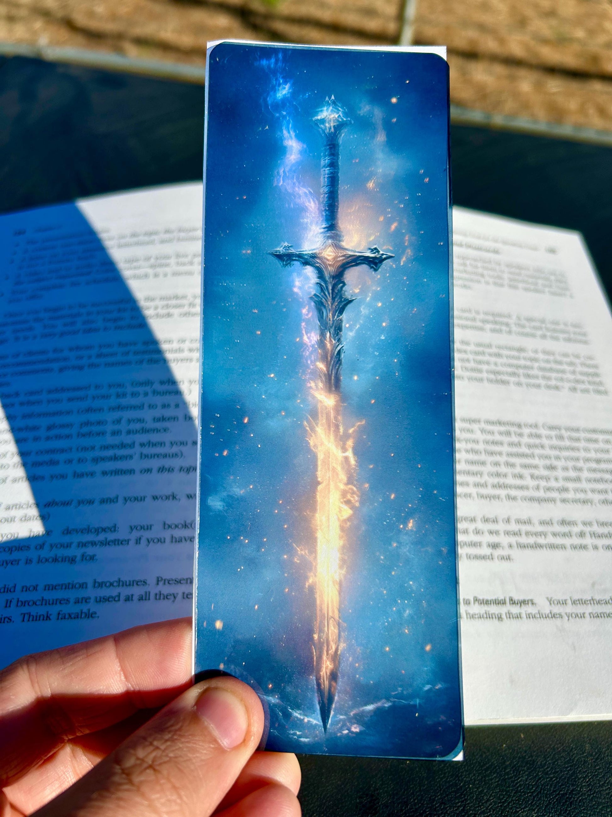 Wield the fire of the stars in your next reading quest 🌌🔥 This powerful bookmark features an enchanted sword ablaze with holy golden light, suspended in the night sky, wrapped in divine energy ⚔️✨