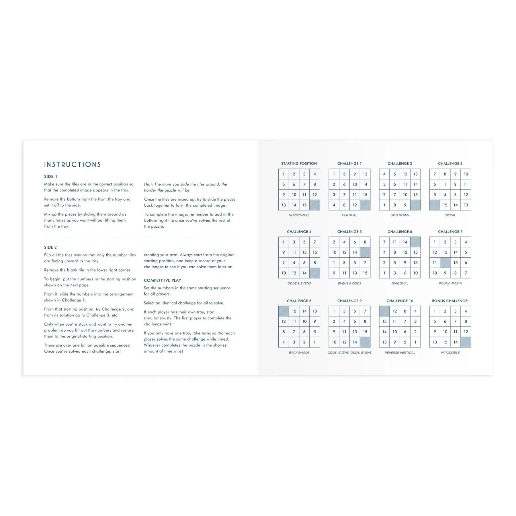 The Frank Lloyd Wright Imperial Hotel 2-in-1 Sliding Wood Puzzle includes both a puzzle and a game. Side 1 is a tile puzzle featuring Wright’s Imperial Hotel Bronze Floor Plate Design and side 2 is the numbers challenge known as “Game of Fifteen”. To play “Game of Fifteen”, the 16th tile is removed. The player slides the tiles (without lifting them off the surface) to match the multiple number sequence challenges provided on the instruction sheet. The tiles are only lifted up to move when the player is stuck and wants to revert to the starting configuration for a new challenge.