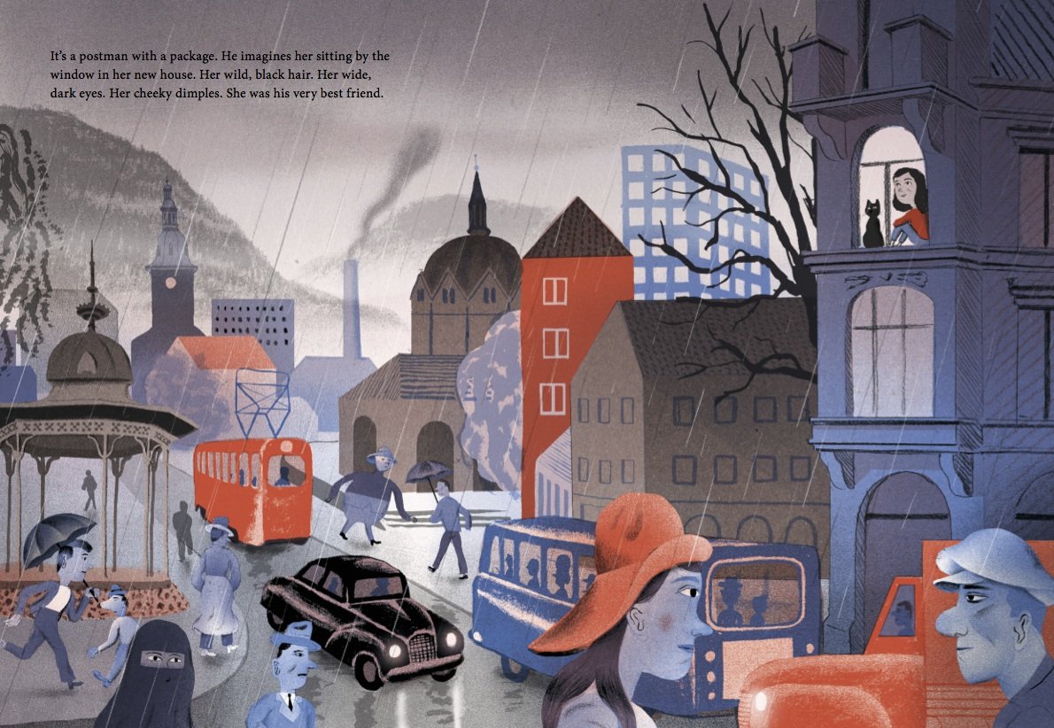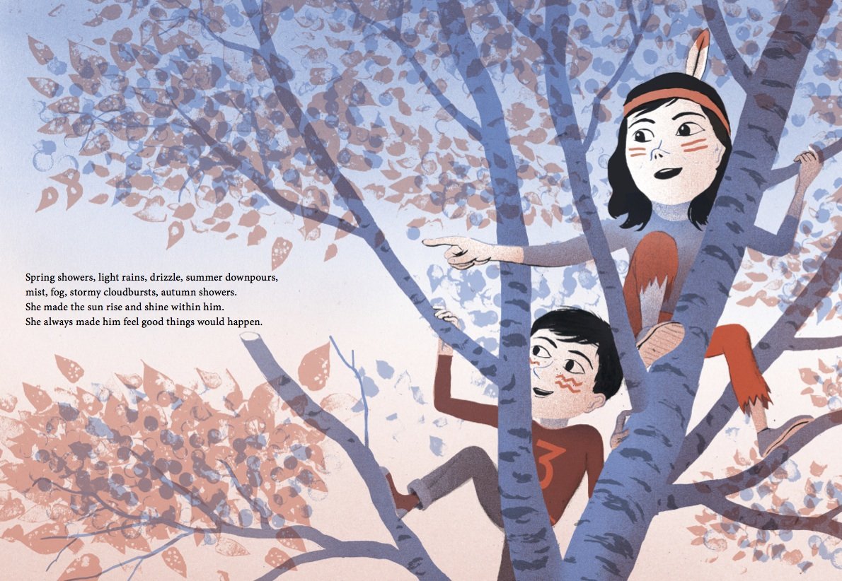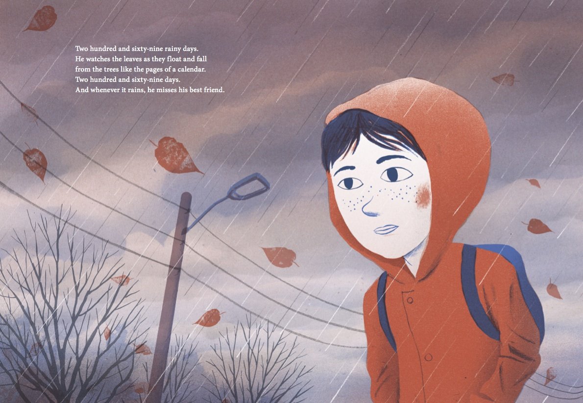 “Two hundred and sixty nine days,” counts a freckle-faced, rosy cheeked boy. His goodbye to his best friend is still fresh within his young heart. Though his companion has moved away, she sends surprise notes and chocolate bars by post, assuaging his pain and bringing a smile to his face. The support of his loving family and the arrival of a new neighbor with her striped cat combine with his optimism to slow the rainfall and welcome the possibility of a new friendship.