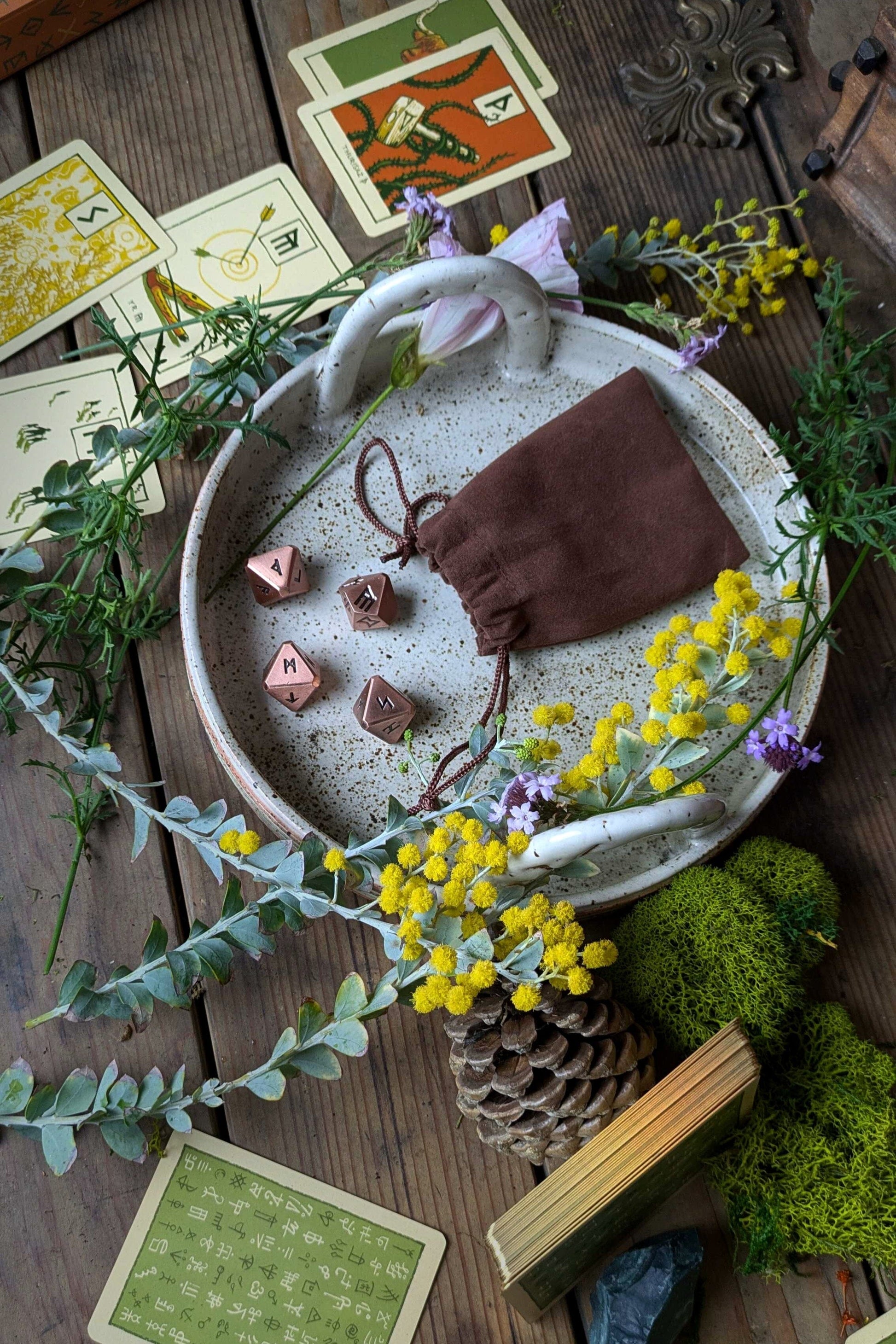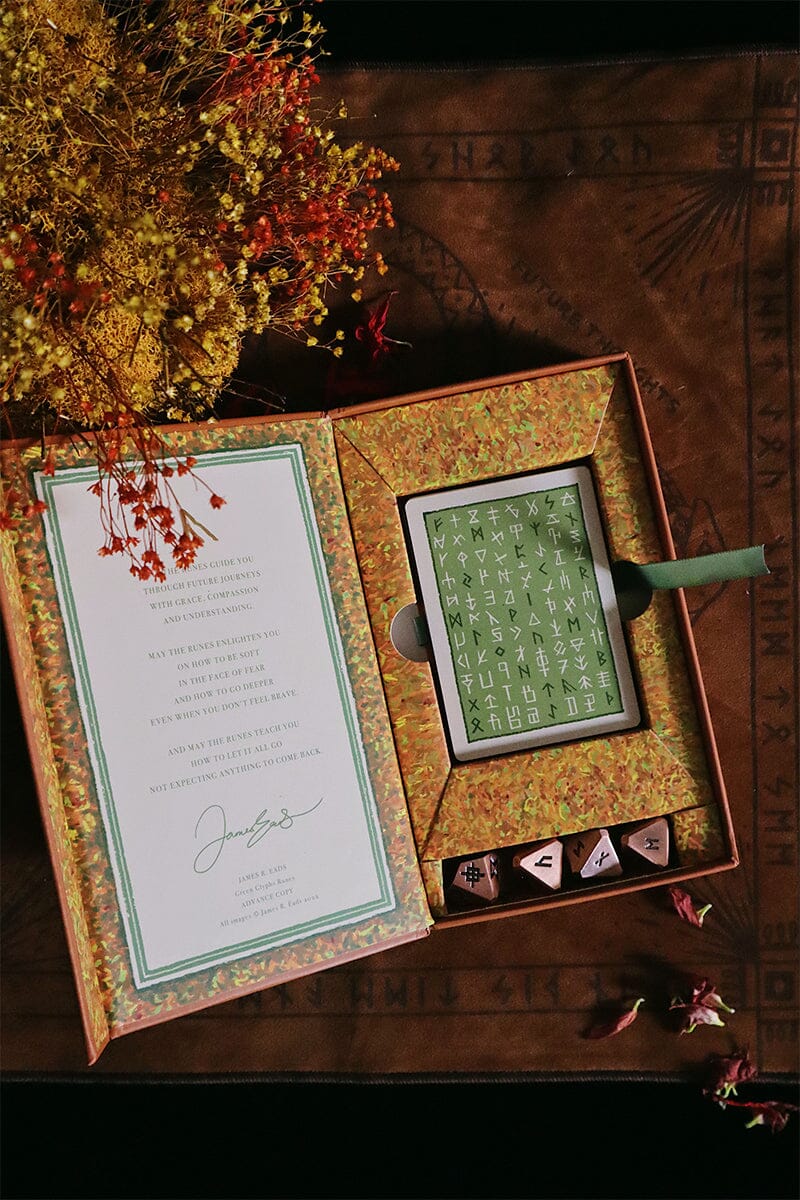 Set of 33 cards with prismatic gold gilded edges in a custom orange box with a 65-page guidebook and 4 runic dice that can be used in tandem with the cards or on their own. Drawstring pouch not included. Learn about Runes here.