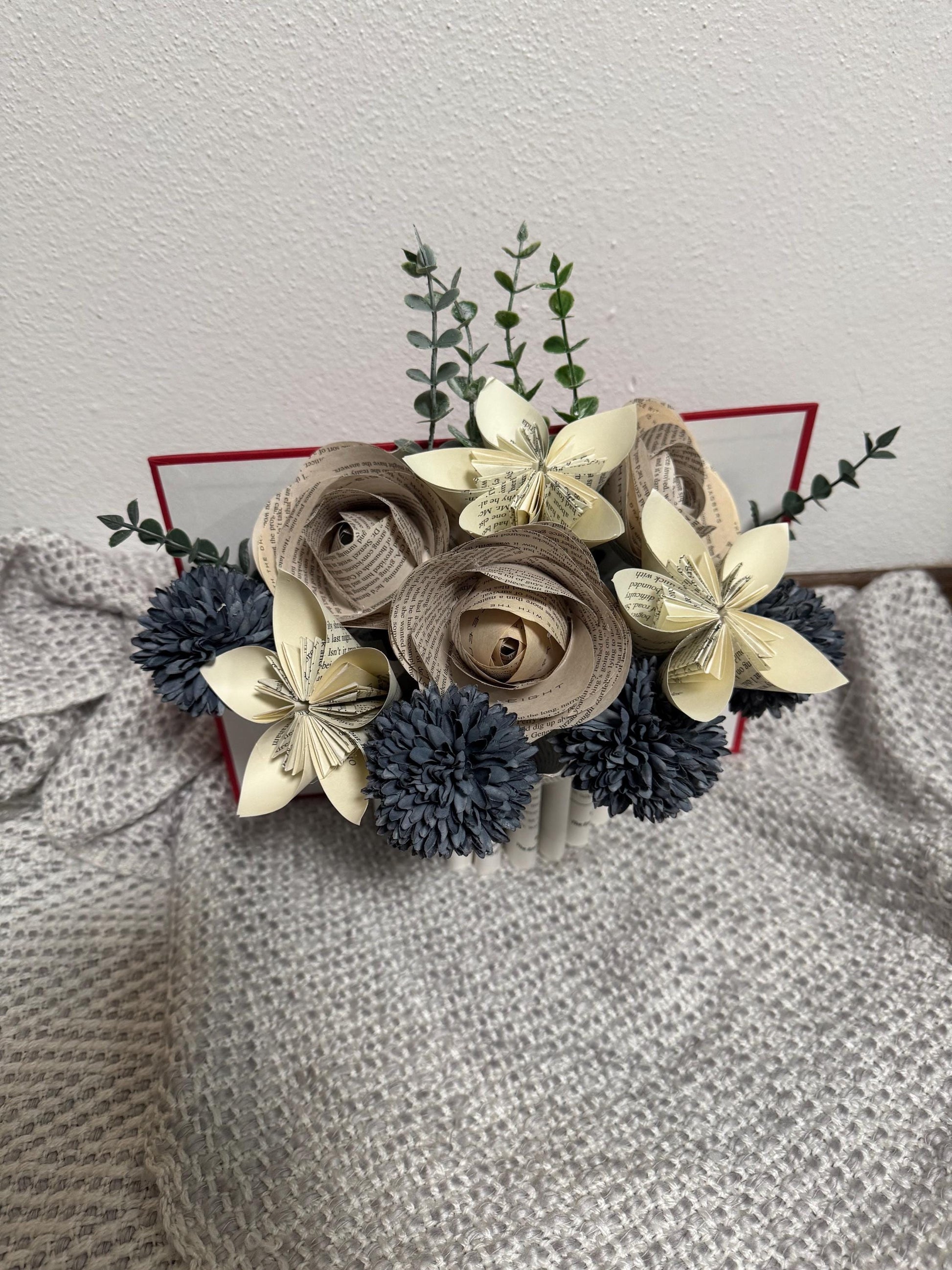 This one-of-a-kind handmade bouquet is crafted from recycled book pages, creating a timeless arrangement perfect for book lovers and literary enthusiasts. Each flower is carefully folded and shaped into roses, kusudama-style blossoms, and textured pom flowers, accented with faux greenery for a natural touch.
