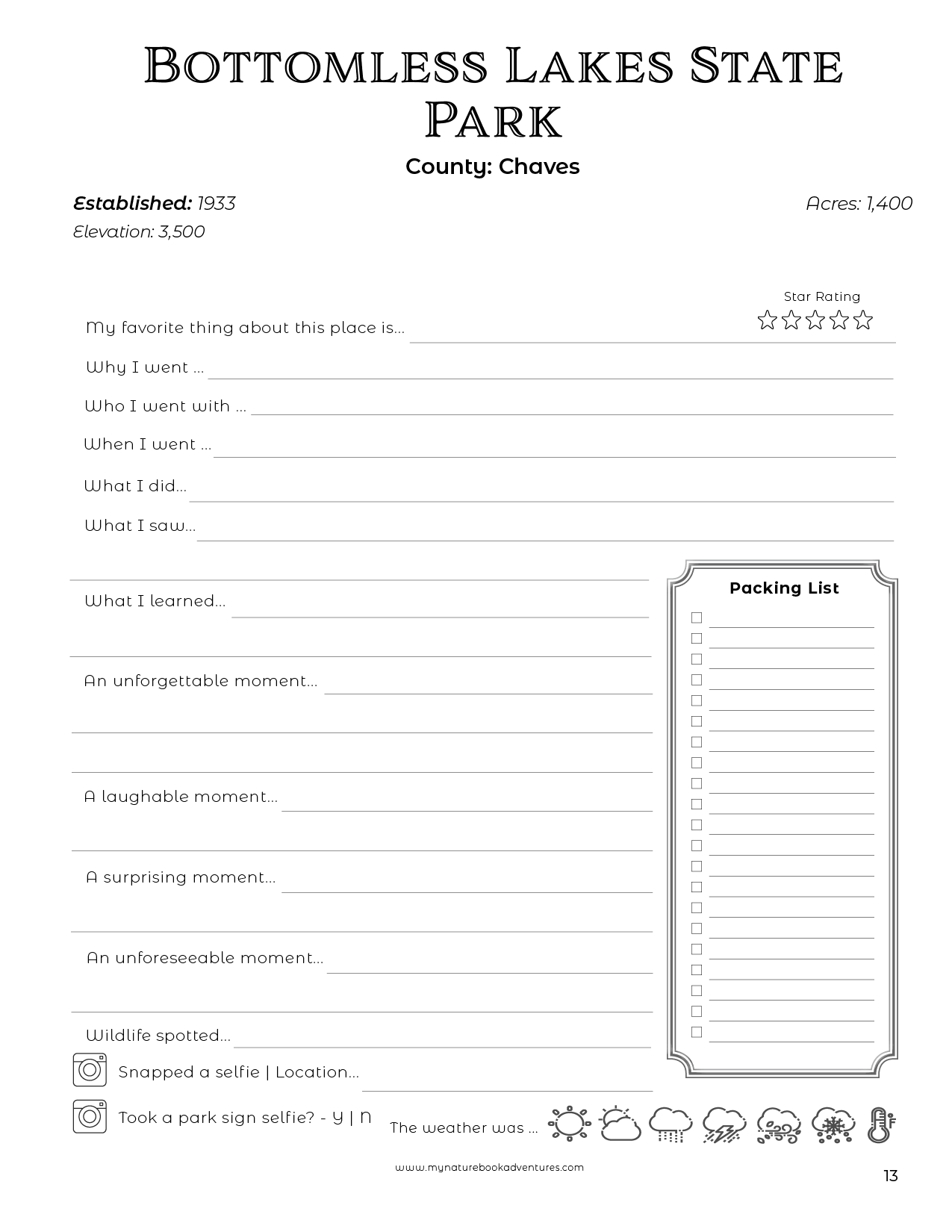 Do you dream of exploring all of the State Parks in New Mexico? The New Mexico State Parks Adventure Book helps you plan, discover, and collect memories from your adventures. With room to write down your must-see sights, plan your trip, and add photos, this adventure book is perfect for nature lovers of all ages. Plus, each page contains interesting facts about the park you’re exploring. Take on the adventure – and find new places to explore, new things to see, and moments to remember!