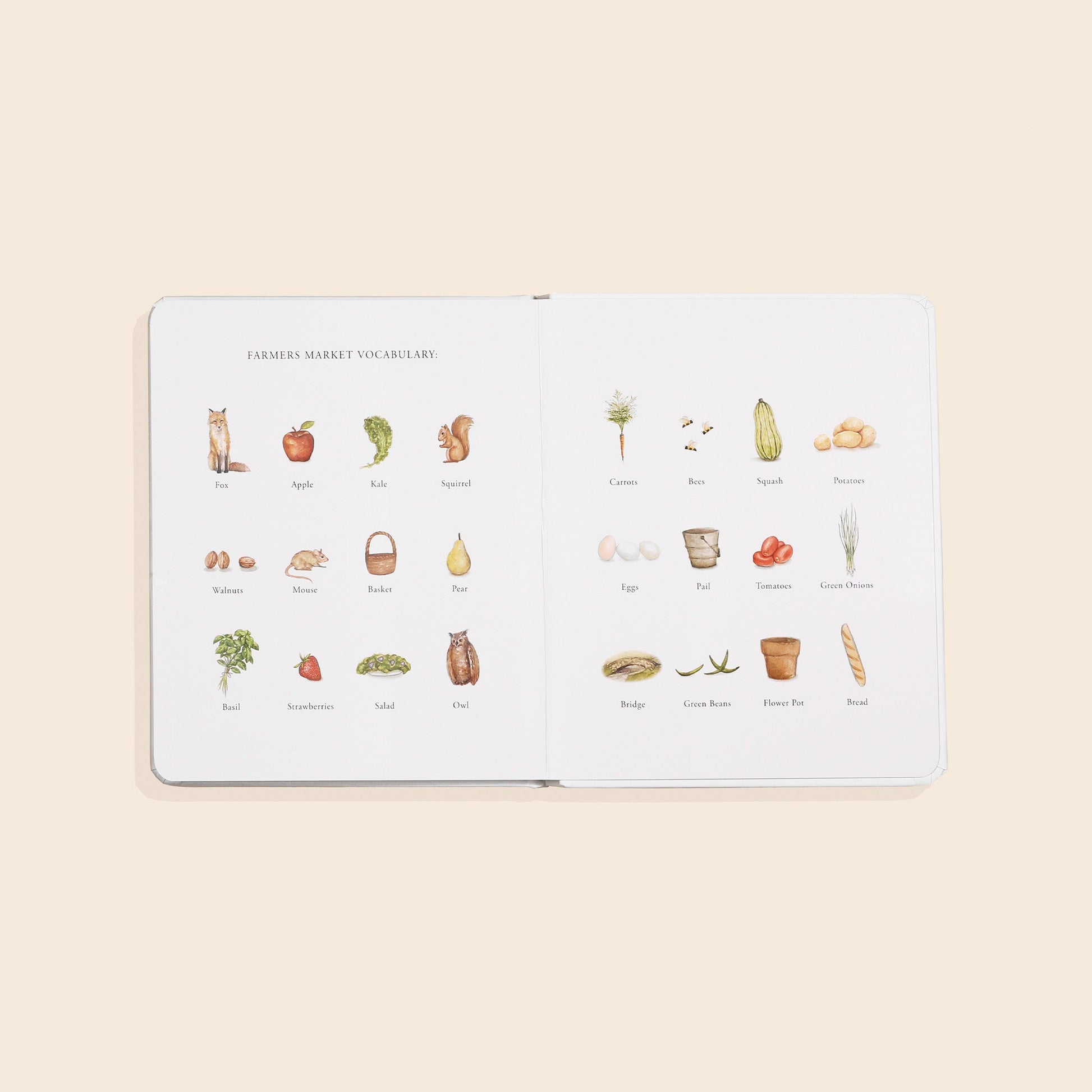 Tabitha Page, Licensed Speech Pathologist and Watercolor Artist, takes you and your child on a trip to the Farmers Market with Little Fox as he gathers his favorite fruits and vegetables.