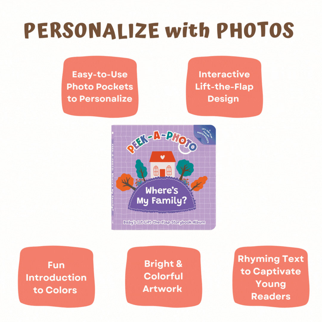 Discover our innovative peekaboo storybook albums designed specifically for babies and toddlers ages 0-3. Think peek-a-boo with family photos, where little ones discover you! Our patent-pending lift-the-flap storybook albums combines the durability of traditional board books with the personalization of family photos, creating meaningful bonding moments during storytime. Each beautifully illustrated page features a delightful lift-the-flap surprise, revealing five hidden photo pockets for: Mama, Dada, Grandma, Grandpa, & a Family Photo with Child or Child alone.