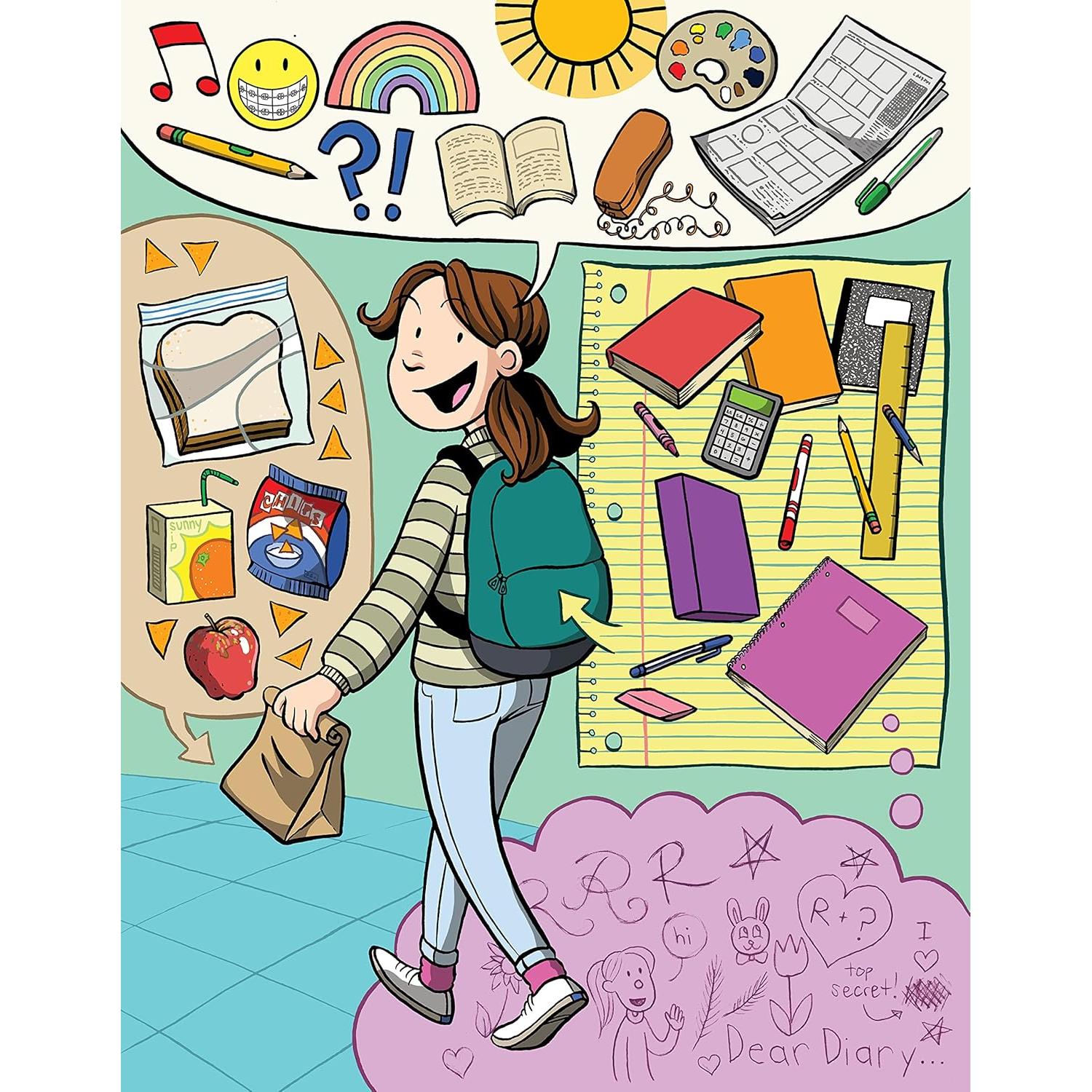 Raina Telgemeier's voice and art are so relatable that middle grade readers feel she is tapping into the joys, challenges, and anxieties of their daily lives. For this 450-piece jigsaw puzzle, she has created a colorful image featuring a smiling girl with a ponytail surrounded by her favorite things, from classic symbols like a rainbow and sunshine to everyday objects such as a phone, a notebook, a sandwich, and a calculator. Once the puzzle is completed, you'll have a keepsake box patterned with Raina's art to safely store souvenirs, notes, and treasures.