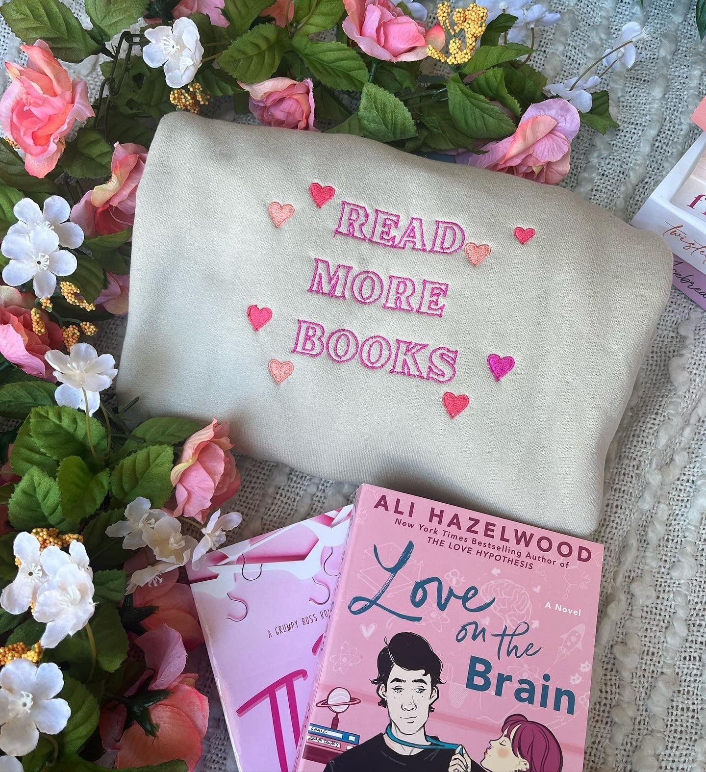 This comfy Crewneck is perfect for any reader! It is embroidered with READ MORE BOOKS and cute hearts surrounding the text.