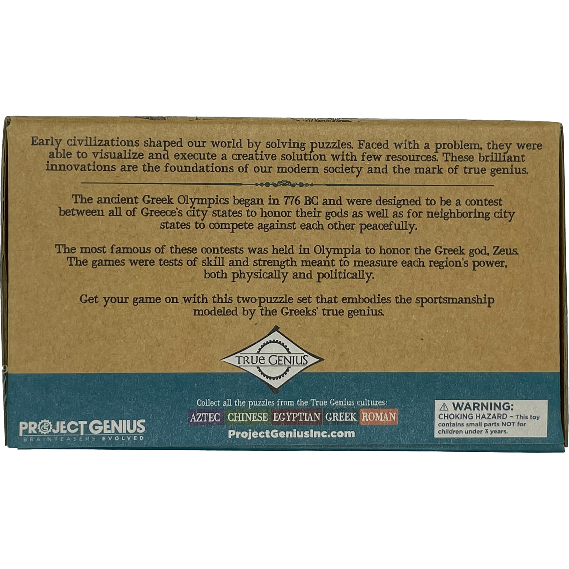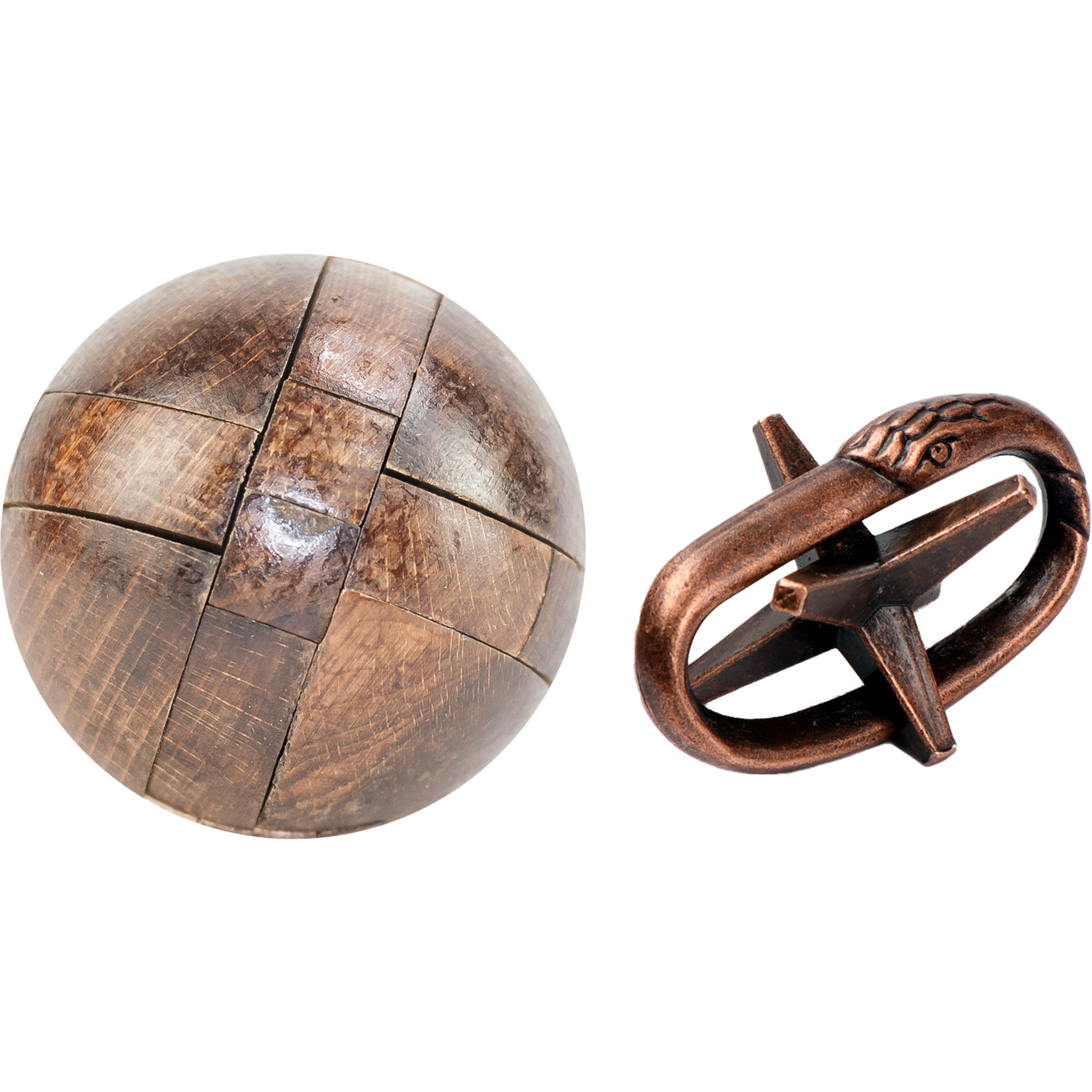 This is a combination of two classic puzzles. The Shotput is a popular style of assembly puzzle that has been finished with a rich, dark wood stain. The Discus is made up of a metal star that must be freed from a circular metal hoop.