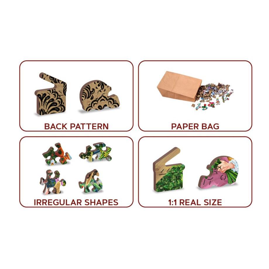 Each puzzle contains numerous unique shapes, characters, figures, and symbols that are cut seamlessly into the pattern. Think of these as mysterious little surprises each puzzle experience offers. These puzzles offer a high quality, rich beautiful image on the front and a detailed wallpaper style pattern on the back. Wooden City double-sided wooden puzzles offer a unique building experience that is sure to captivate puzzle enthusiasts of all ages.