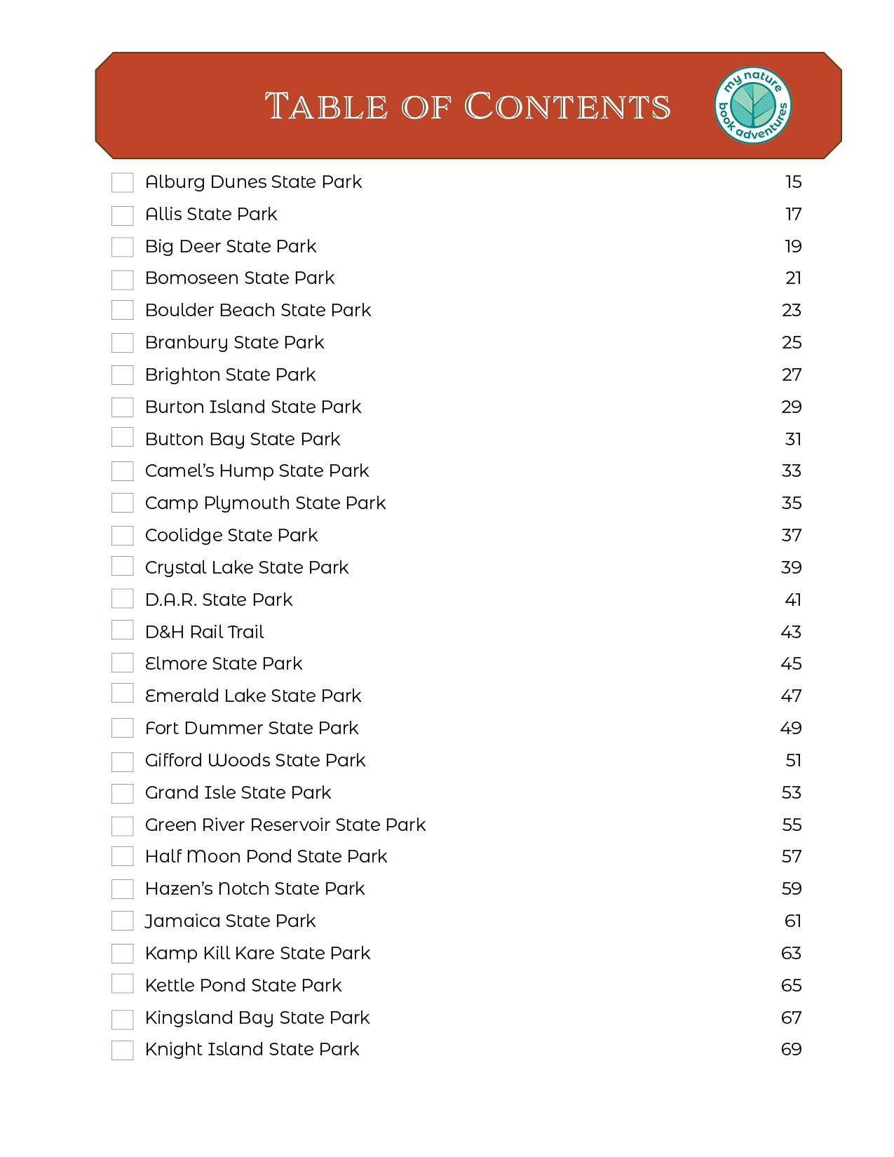 Do you dream of exploring all of the State Parks in Vermont? The Vermont State Parks Adventure Book helps you plan, discover, and collect memories from your adventures. With room to write down your must-see sights, plan your trip, and add photos, this adventure book is perfect for nature lovers of all ages. Plus, each page contains interesting facts about the park you’re exploring. Take on the adventure – and find new places to explore, new things to see, and moments to remember!